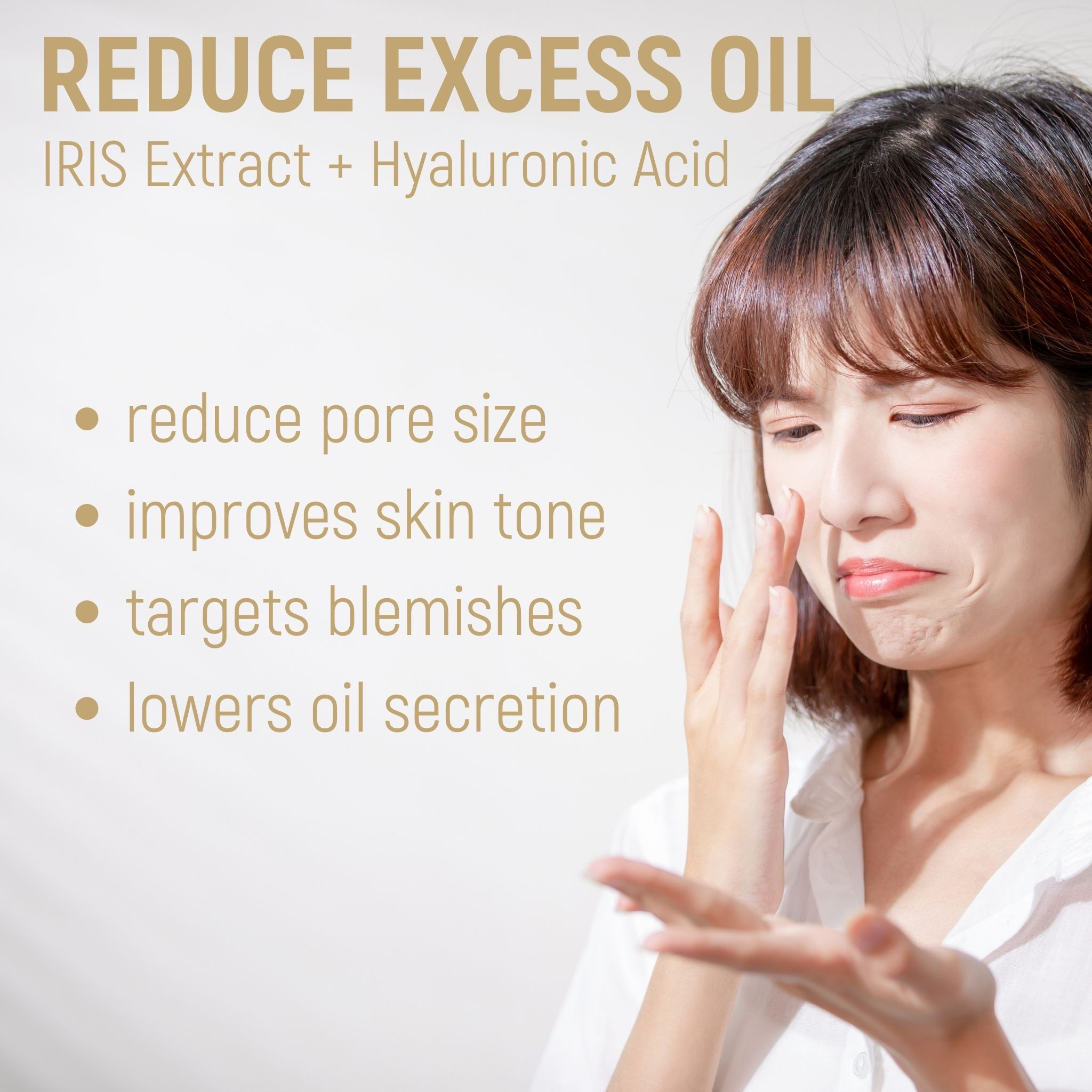 Iris Extract and Hyaluronic Acid improves skin tone, lowers oil secretion, and reduces pore size and blemishes by removing bacteria, preventing future acne breakouts.